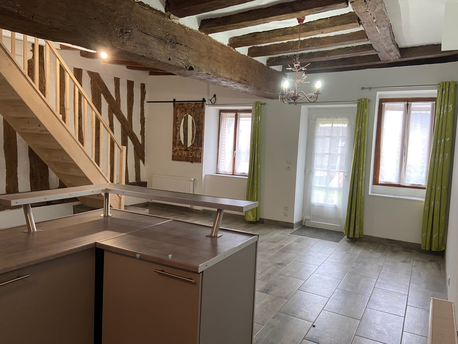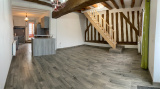 - Au Rez de chaussée : un séjour avec poutres et colombage, cuisine aménagée et équipée, chambre, salle d'eau, pièce avec chaudière à pellets, véranda chauffée.